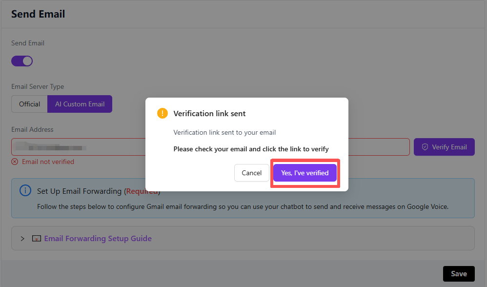 Click the Verify Email button, and you will see a pop-up dialog.